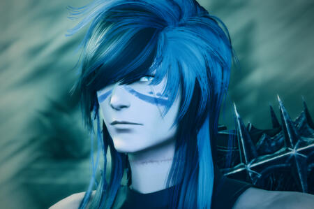 Distinguishing Features: He has a large scar around his neck from his beheading, another scar through his left eye, along with a large bullet wound scar on the right of his waist down to his hip. The star motif present in many of his features and his contract between Lunalis appears on his chest. His left arm is completely aetherically scarred, looking completely unlike normal skin, rather patterns of black and blue glowing aether up to his shoulder where it dissipates. He has a tattoo of his experiment number 0545 on his right wrist, and a tattoo of blue streaks and dots across his face.